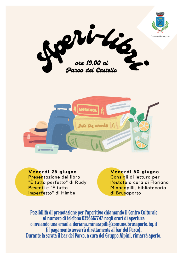 Ritorna l'appuntamento con "Aperi-libri", l'evento del Comune di Brusaporto per scoprire alcune letture estive: venerdì 23 e 30 giugno 2023 alle ore 19.00 al Parco del Castello.