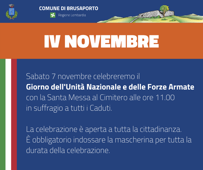 Sabato 7 novembre celebreremo il Giorno dell'Unità Nazionale e delle Forze Armate con la Santa Messa al Cimitero alle ore 11.00 in suffragio a tutti i Caduti.