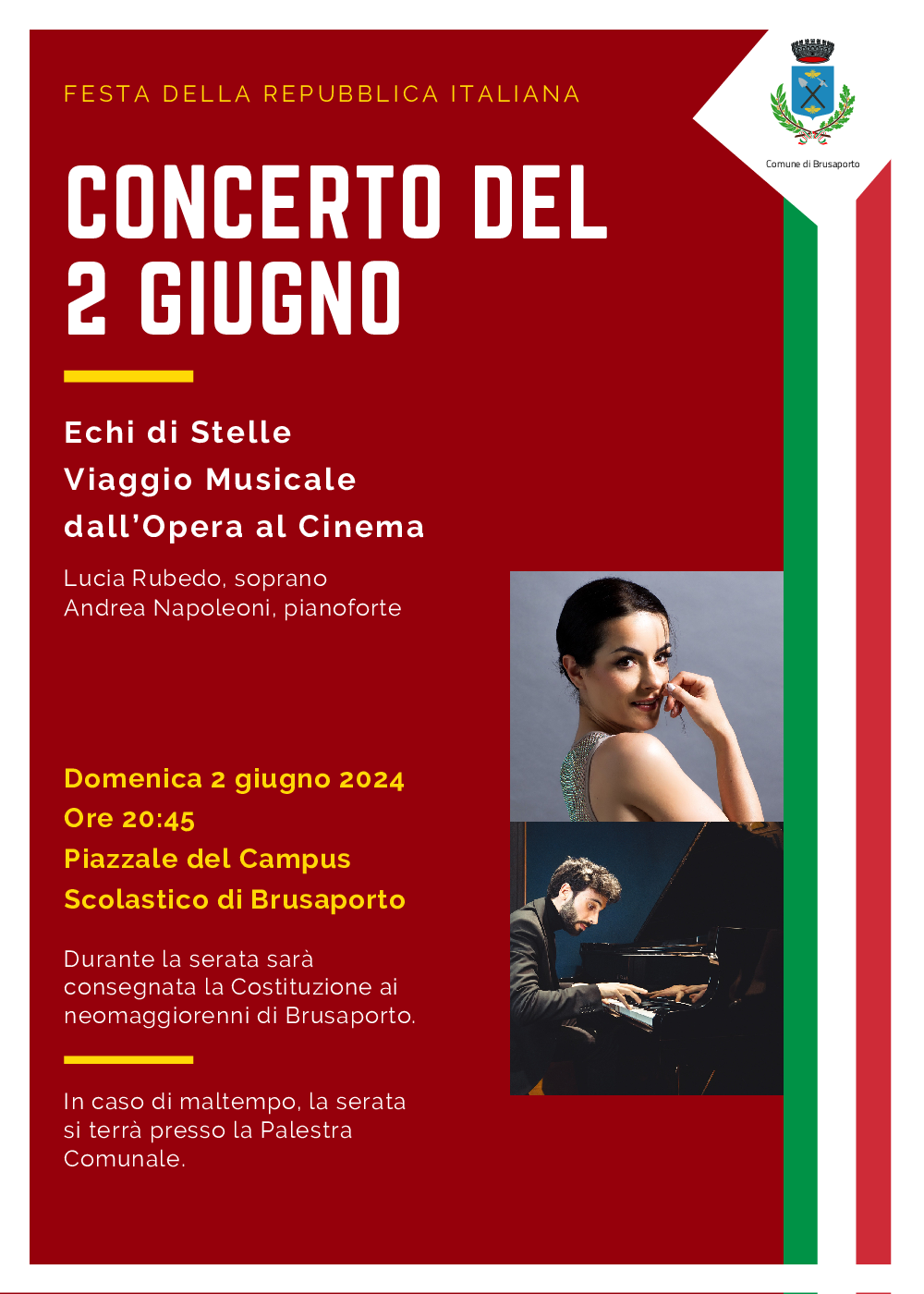 Come ogni anno, il 2 giugno a Brusaporto si tiene il concerto musicale. Quest'anno il tema sarà "Echi di Stelle: Viaggio Musicale dall'Opera al Cinema" con Lucia Rubedo e Andrea Napoleoni.