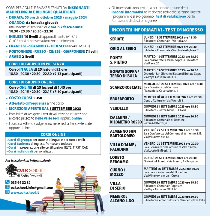 Ripartono a Brusaporto gli attesi corsi di lingue straniere. Partecipa all'incontro informativo per saperne di più: mercoledì 20 settembre 2023 alle ore 20:30 presso il Centro Culturale.