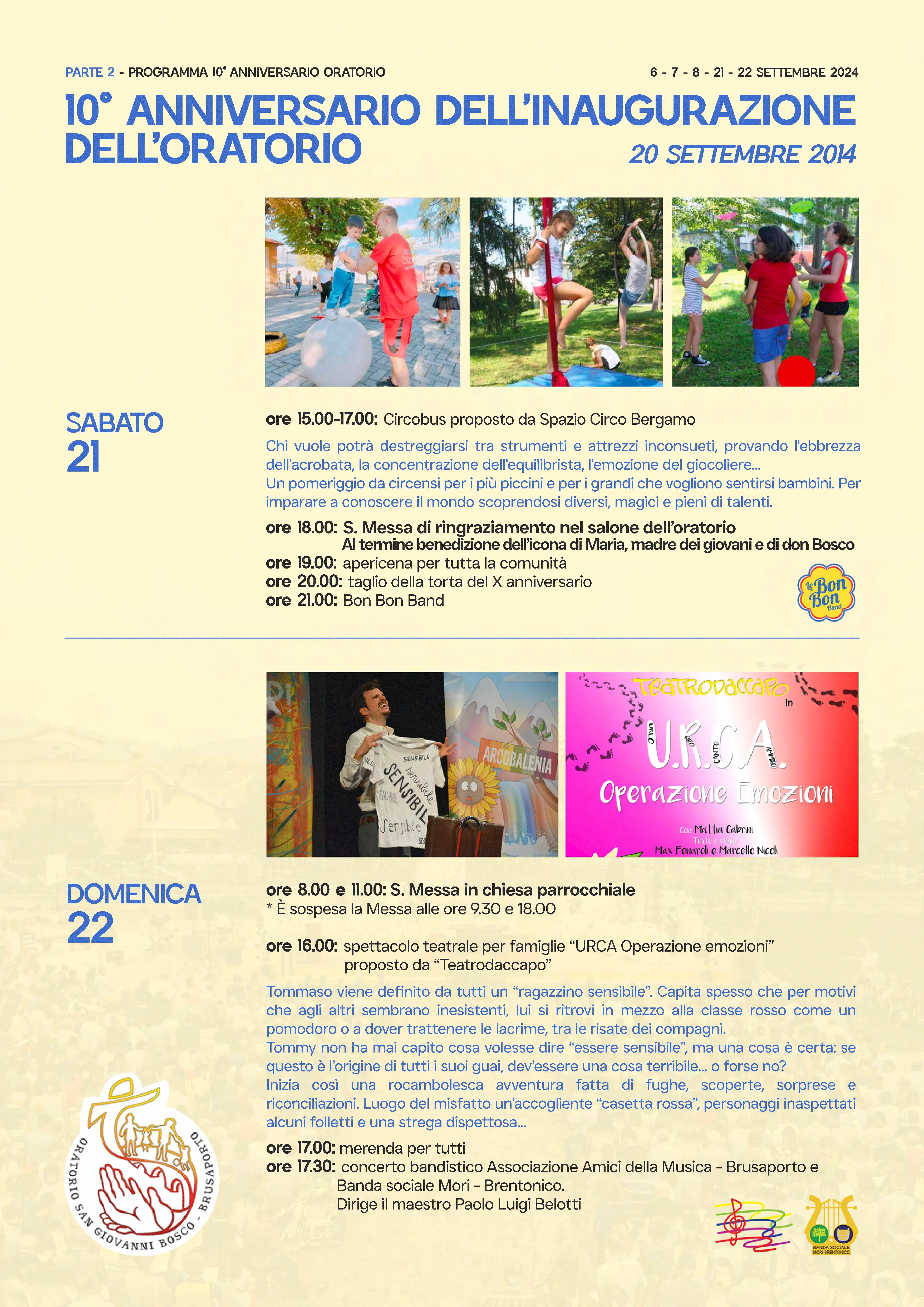 Dettagli dell'evento A settembre 2024 siamo pronti per festeggiare il decimo anniversario dall'inaugurazione del nuovo Oratorio "San Giovanni Bosco" di Brusaporto. Tanti gli appuntamenti e gli eventi del 21 e 22 settembre 2024.