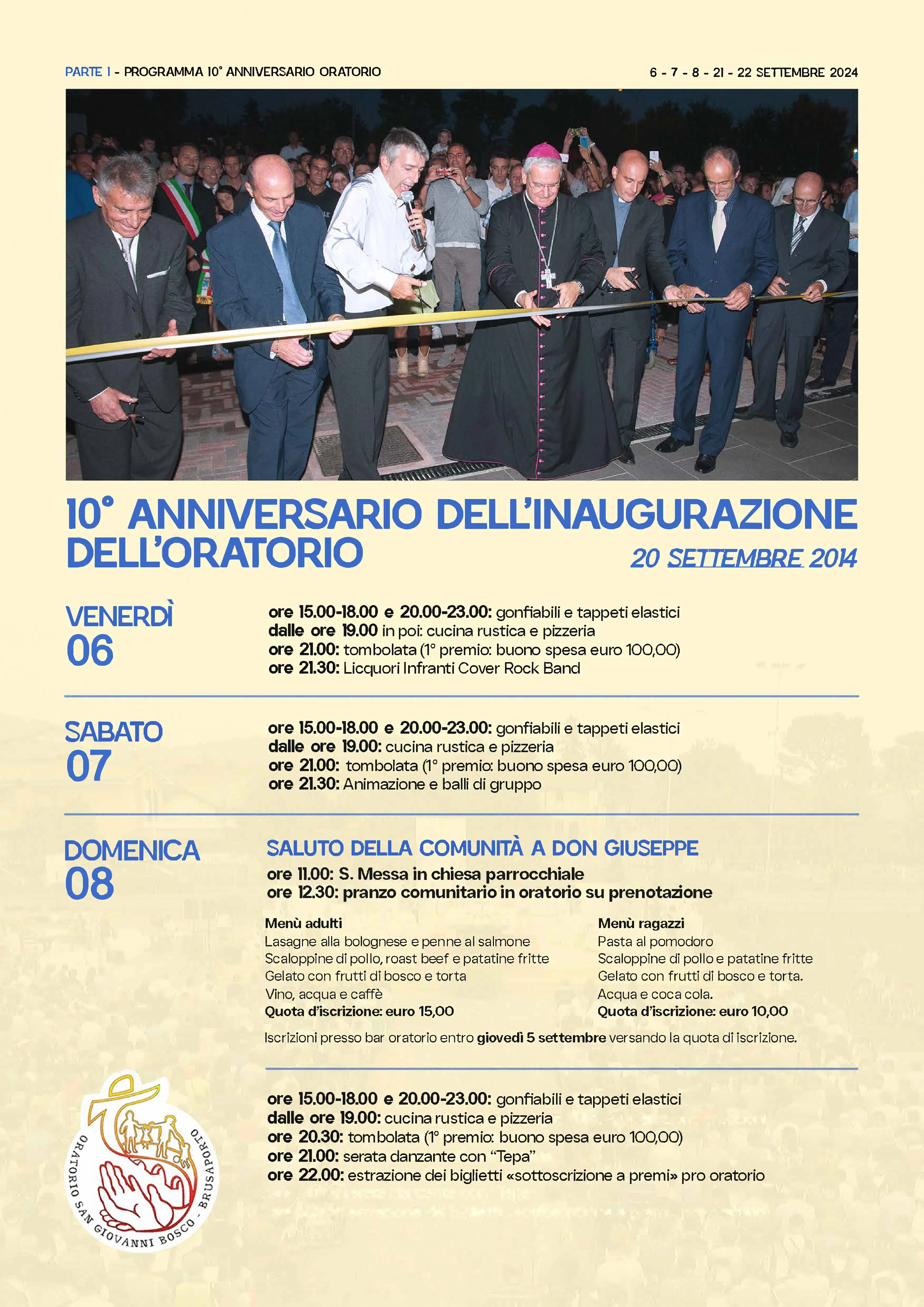 Dettagli dell'evento A settembre 2024 siamo pronti per festeggiare il decimo anniversario dall'inaugurazione del nuovo Oratorio "San Giovanni Bosco" di Brusaporto. Tanti gli appuntamenti e gli eventi, dal 6 all'8 settembre 2024.