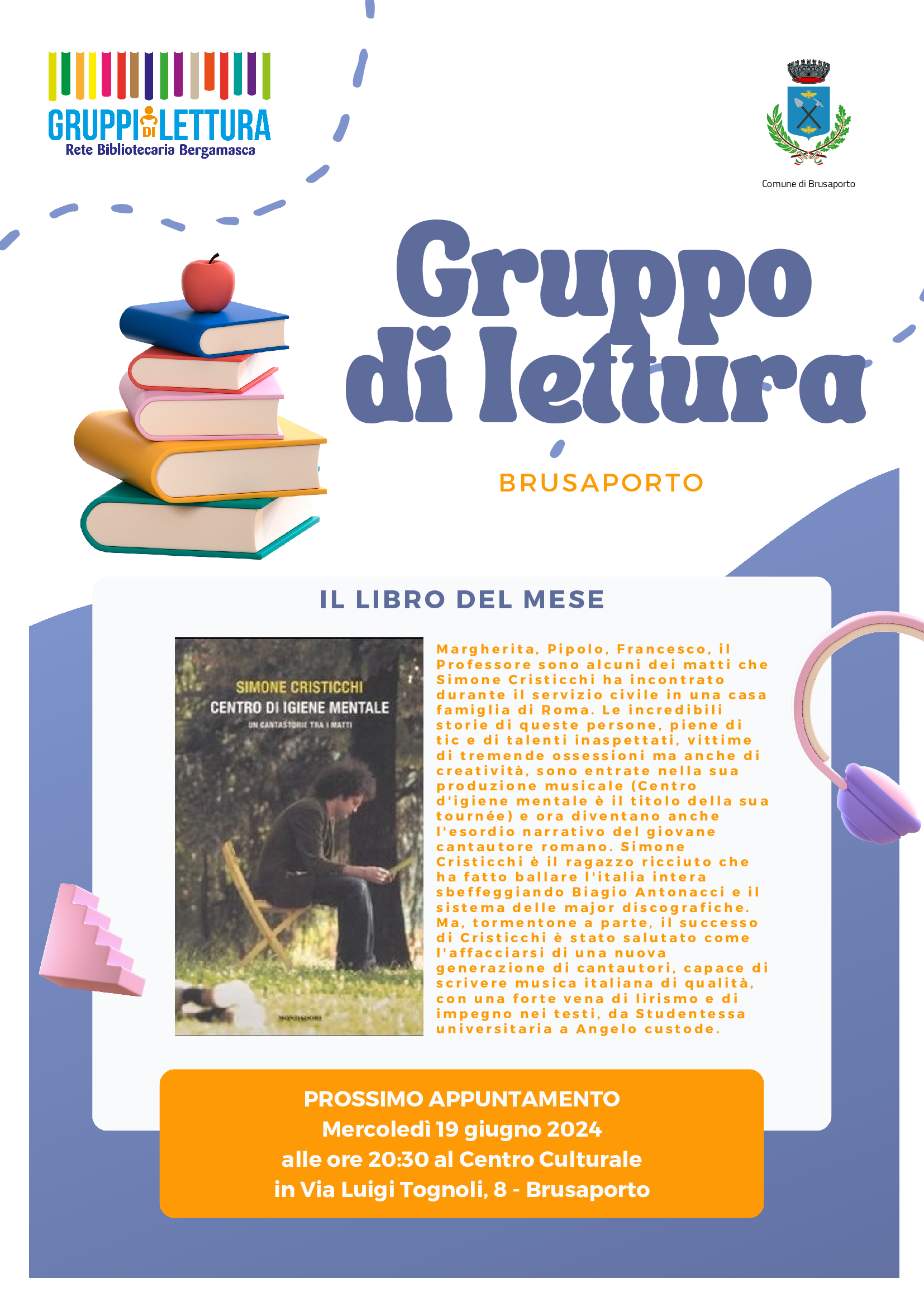 Il prossimo incontro sarà mercoledì 19 giugno 2024 alle ore 20:30 al Centro Culturale e leggeremo il libro "Centro di igiene mentale: un cantastorie tra i matti" di Simone Cristicchi, se vuoi partecipare passa in Biblioteca a prenotare la tua copia!