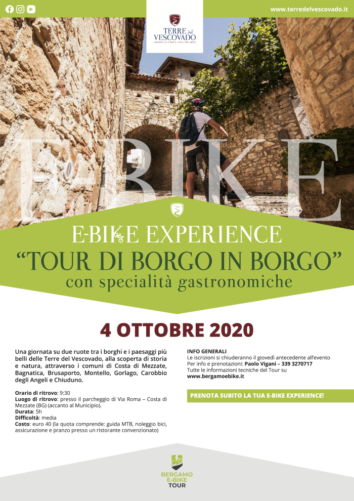 Terre del Vescovado e il Comune di Brusaporto propongono una giornata su due ruote tra i borghi e i paesaggi più belli delle Terre del Vescovado, alla scoperta di storia e natura, attraverso i comuni di Costa di Mezzate, Bagnatica, Brusaporto, Montello, Gorlago, Carobbio degli Angeli e Chiuduno.