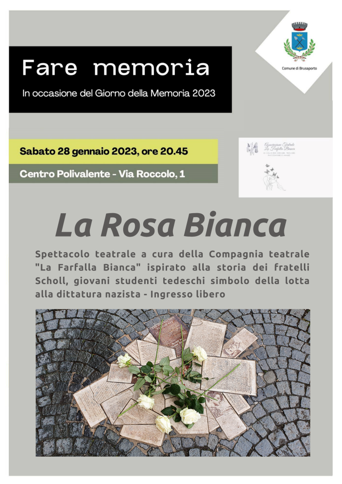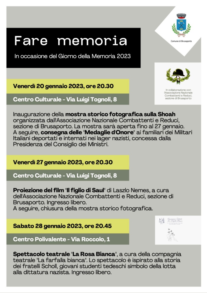 In occasione del Giorno della Memoria, anche quest'anno il Comune di Brusaporto presenta tre appuntamenti, organizzati in collaborazione con la sezione di Brusaporto dell'Associazione Nazionale Combattenti e Reduci e della compagnia teatrale "La farfalla bianca".