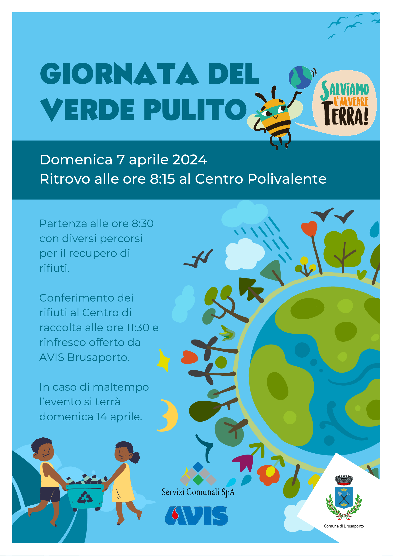 Ritrovo alle ore 8:15 sul piazzale del Centro Polivalente. Partenza alle ore 8:30 con diversi percorsi per il recupero dei rifiuti. Conferimento dei rifiuti al Centro di raccolta alle ore 11:30 e rinfresco offerto da AVIS Brusaporto.