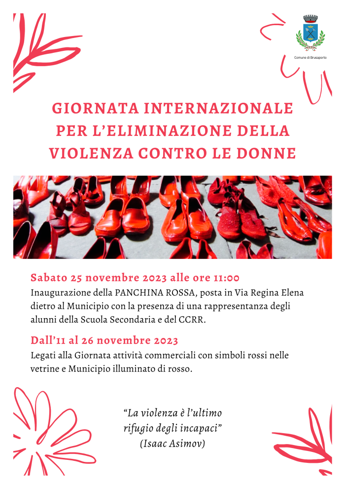 In occasione della Giornata internazionale per l'eliminazione della violenza contro le donne, il Comune di Brusaporto inaugura la nuova panchina rossa, posta in Via Regina Elena dietro al Municipio, con la presenza di una rappresentanza degli alunni della Scuola Secondaria e del CCRR.