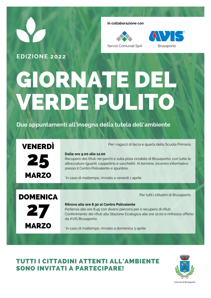 Aspettiamo tutti alle Giornate del Verde Pulito: domenica 27 marzo dalle ore 8.30 con ritrovo al Centro Polivalente.