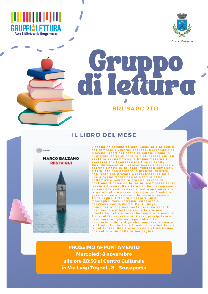 Il prossimo incontro sarà mercoledì 8 novembre alle ore 20.:30 al Centro Culturale e leggeremo il libro "Resto Qui" di Marco Balzano, se vuoi partecipare passa in Biblioteca a prenotare la tua copia!