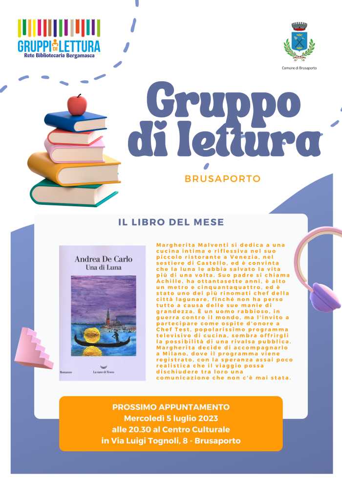 È in arrivo l'ottavo incontro del gruppo di lettura! Il prossimo incontro sarà mercoledì 5 luglio alle 20.30 al Centro Culturale e leggeremo il libro "Una di Luna" di Andrea De Carlo, se vuoi partecipare passa in Biblioteca a prenotare la tua copia!
