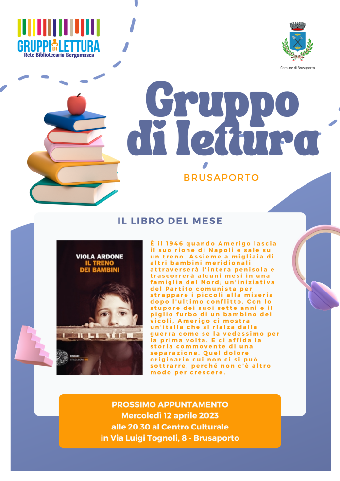 Il prossimo incontro sarà mercoledì 12 aprile alle 20.30 al Centro Culturale e leggeremo il libro "Il treno dei bambini" di Viola Ardone, se vuoi partecipare passa in Biblioteca a prenotare la tua copia!