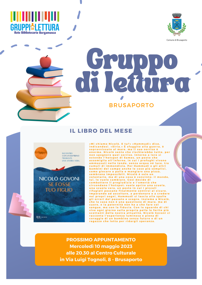 Il prossimo incontro sarà mercoledì 10 maggio alle 20.30 al Centro Culturale e leggeremo il libro "Se fosse tuo figlio" di Nicolò Govoni, se vuoi partecipare passa in Biblioteca a prenotare la tua copia!