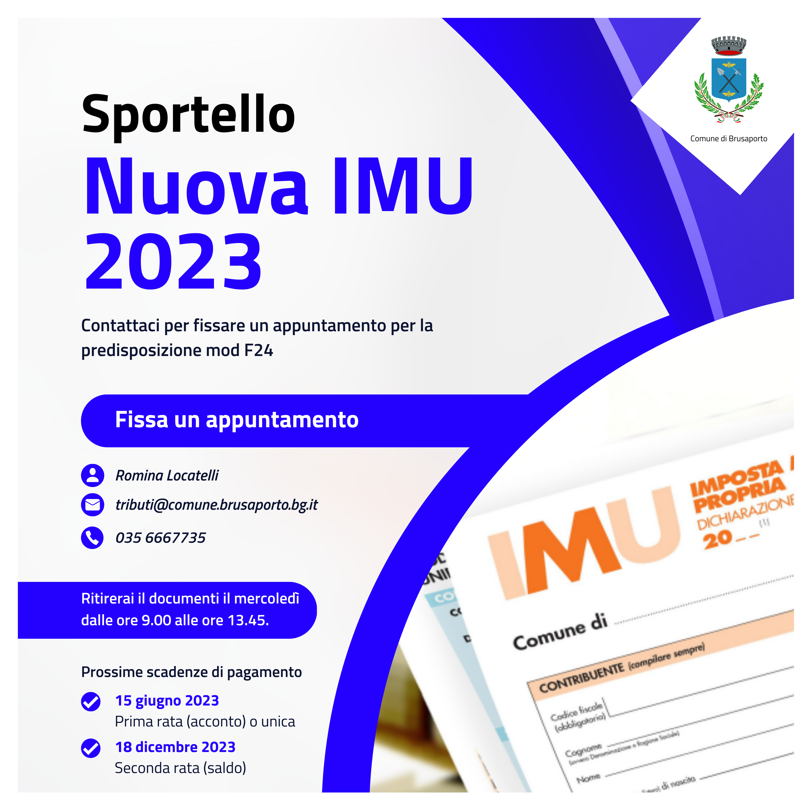 Anche per il 2023 il Comune di Brusaporto apre lo "Sportello IMU" per inviare, tramite email o direttamente in ufficio, i modelli F24 compilati con l'importo dell'IMU a coloro che ne faranno richiesta (solo alle persone fisiche).