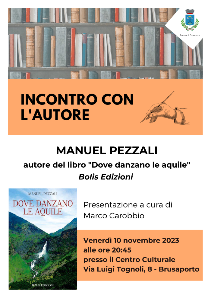 La rassegna "Incontro con l'autore" prosegue con la presentazione del libro "Dove danzano le aquile" dell'autore Manuel Pezzali. L'appuntamento è per venerdì 10 novembre 2023 alle ore 20:45 presso il Centro Culturale. Ingresso libero.