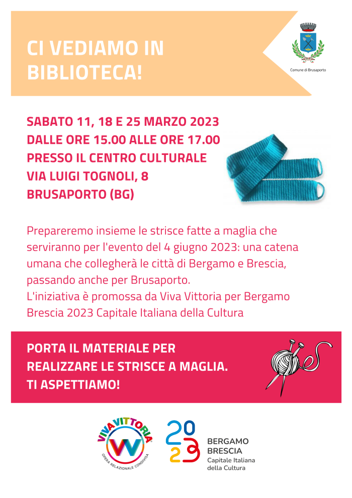 Incontriamoci al Centro Culturale per creare insieme le strisce fatte a maglia che serviranno per l’evento del 4 giugno in occasione di Bergamo Brescia Capitale della Cultura 2023.