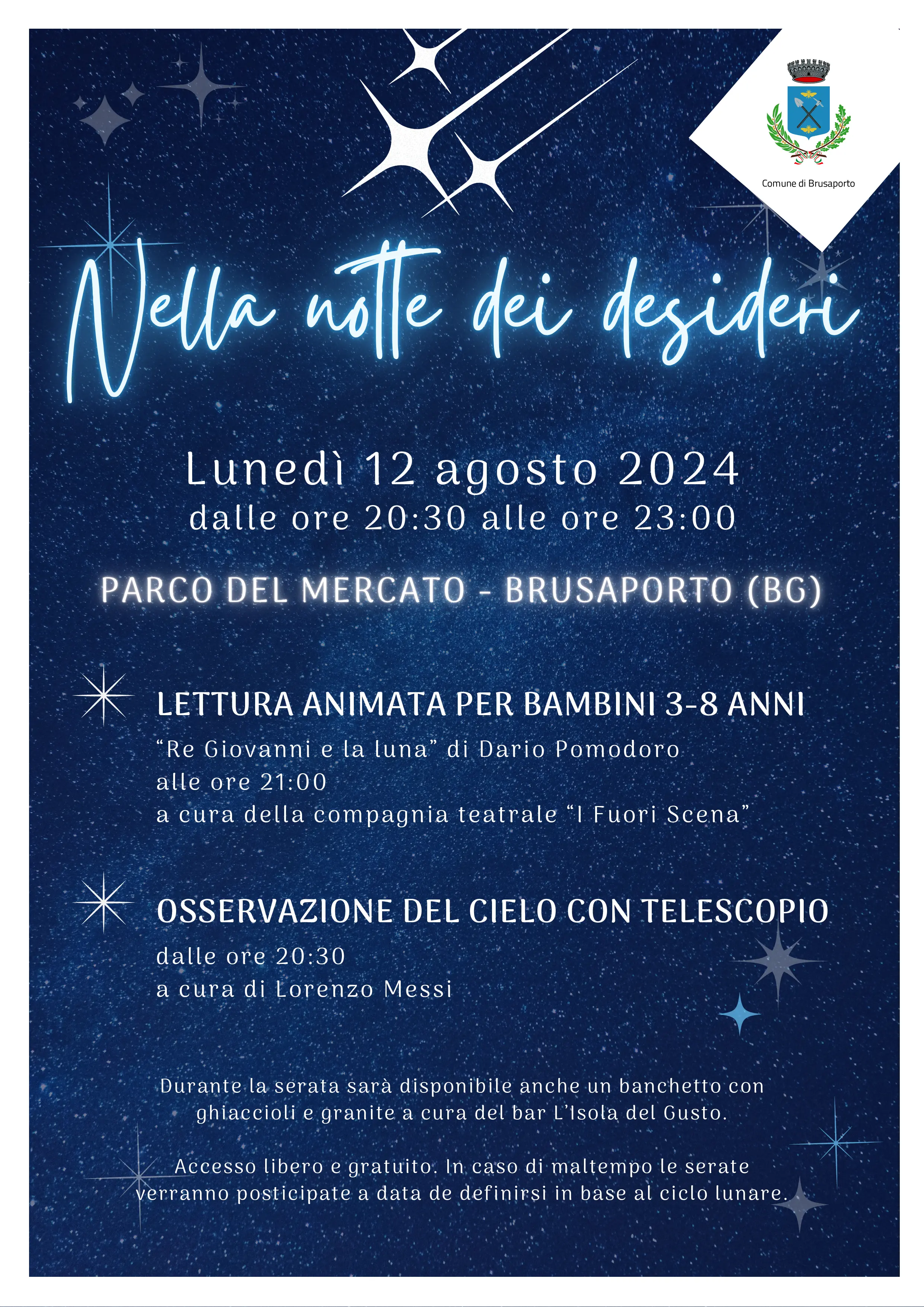 La serata sarà introdotta alle ore 21:00 dalla lettura animata "Re Giovanni e la luna" di Dario Pomodoro per i bambini dai 3 agli 8 anni, a cura della compagnia teatrale “I Fuori Scena”.