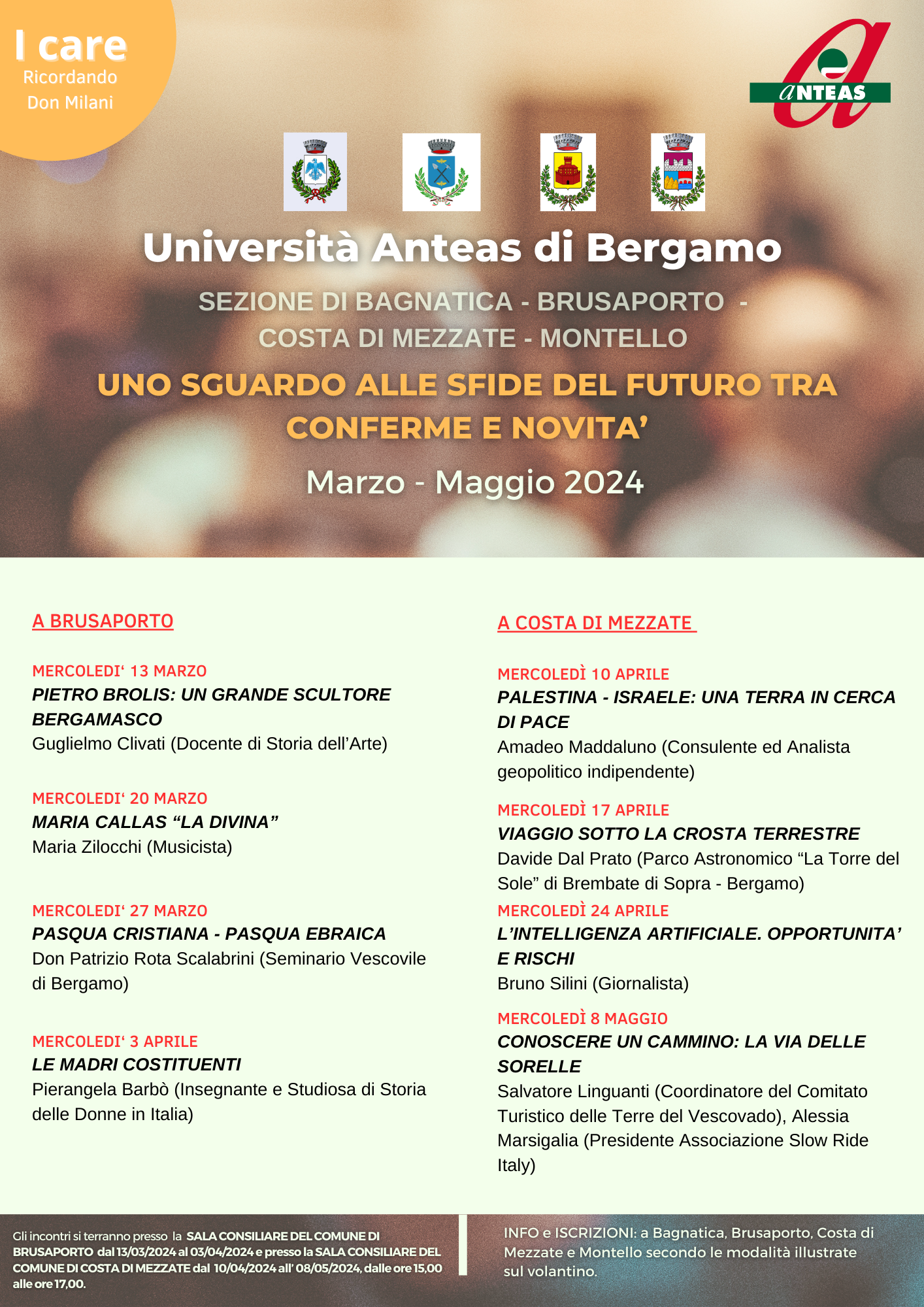 Dettagli dell'evento Anteas Bergamo organizza otto incontri dell'Università della terza età insieme ai comuni di Brusaporto, Bagnatica, Costa di Mezzate e Montello.