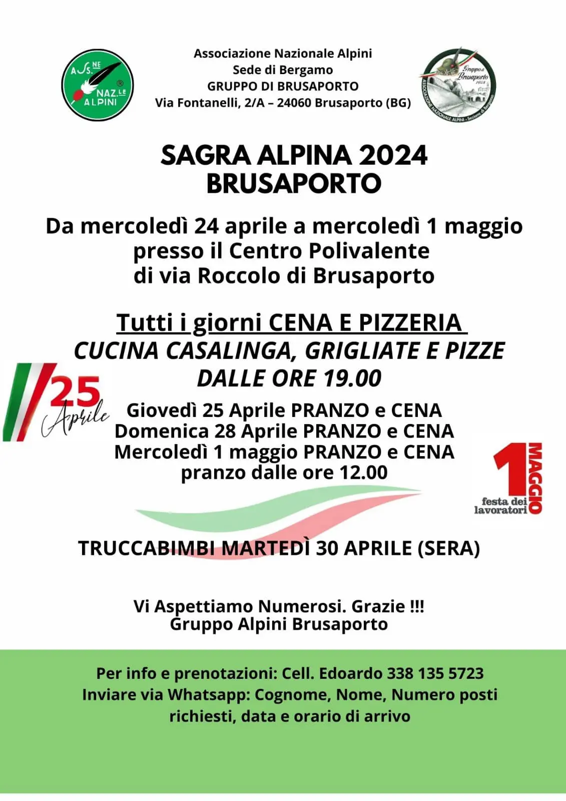 Dettagli dell'evento Il Gruppo Alpini di Brusaporto organizza la Sagra Alpina 2024, dal 24 aprile all'1 maggio 2024 al Centro Polivalente. Cucina, grigliate e pizze in compagnia.