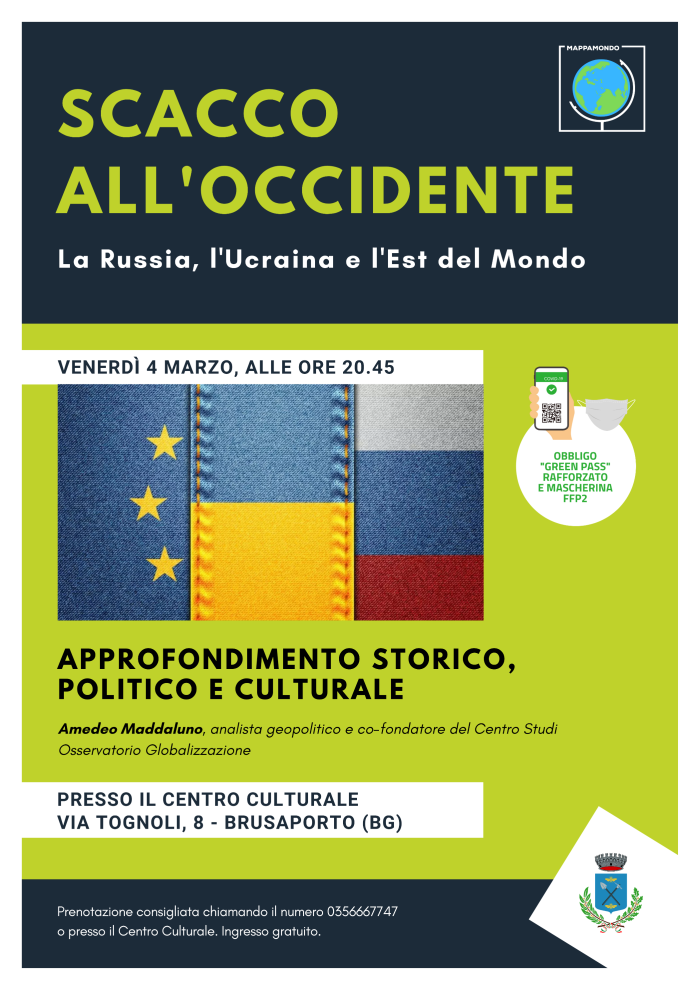 La difficile situazione che sta vivendo l'Ucraina non può lasciare indifferenti l'Italia e l'Europa, soprattutto con la Russia parte attiva dei "giochi". Quali sono le motivazioni che hanno portato alla crisi? Che ruolo giocano l'Europa e gli Stati Uniti? Quali situazioni sta vivendo il popolo ucraino? A queste e ad altre domande cercheremo di rispondere nel prossimo incontro del ciclo "Mappamondo": venerdì 4 marzo 2022 alle ore 20.45 presso il Centro Culturale.