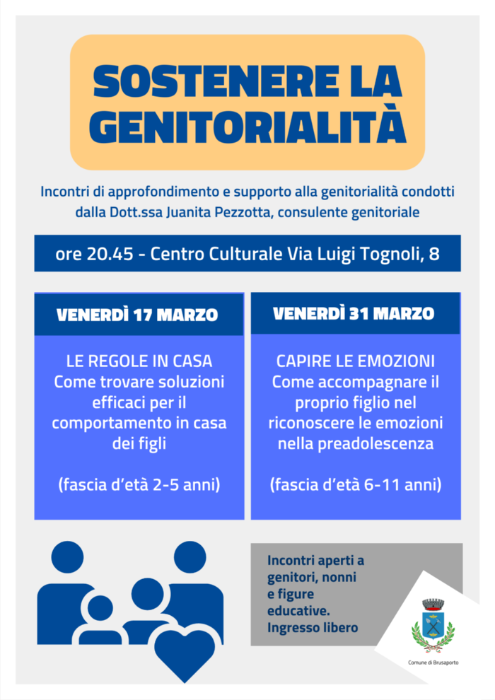 Incontri di approfondimento e supporto alla genitorialità condotti dalla Dott.ssa Juanita Pezzotta, consulente genitoriale. Incontri aperti a genitori, nonni e figure educative.