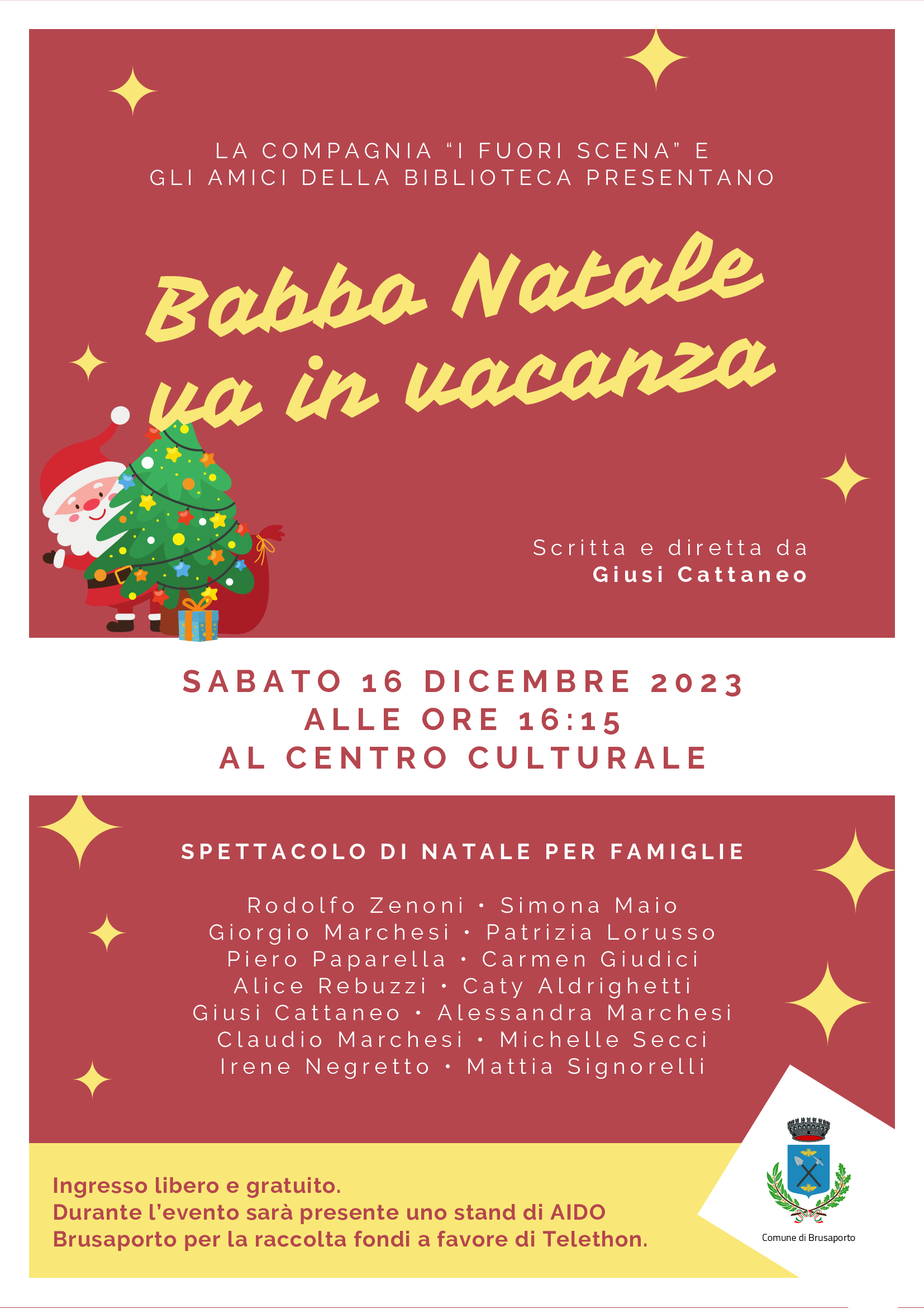 La compagnia "I Fuori Scena" e gli "Amici della Biblioteca" presentano lo spettacolo dal titolo "Babbo Natale va in vacanza". Appuntamento per sabato 16 dicembre 2023 alle ore 16:15 presso il Centro Culturale.