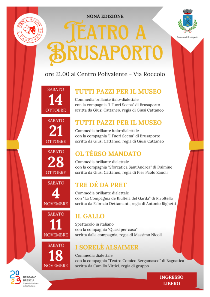 La nona edizione della rassegna "Teatro a Brusaporto" presenta sei serate tra commedie in italiano e in dialetto bergamasco. Ingresso libero.