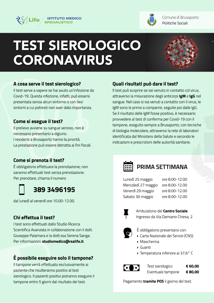 Il Comune di Brusaporto avvisa che da lunedì 25 maggio sarà possibile effettuare il test sierologico per Coronavirus nell'Ambulatorio del Centro Sociale.