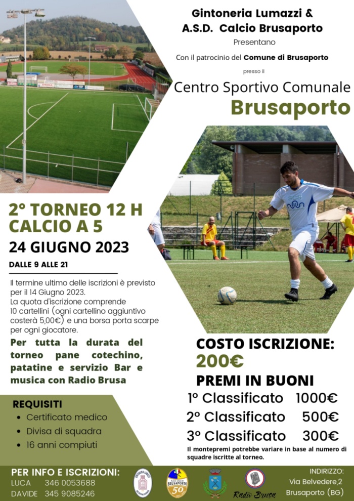 Ritorna il secondo torneo di calcio a 5 al Centro Sportivo di Brusaporto! Appuntamento per sabato 24 giugno 2023 dalle ore 9.00 alle ore 21.00 per dodici ore di grande spettacolo e divertimento.