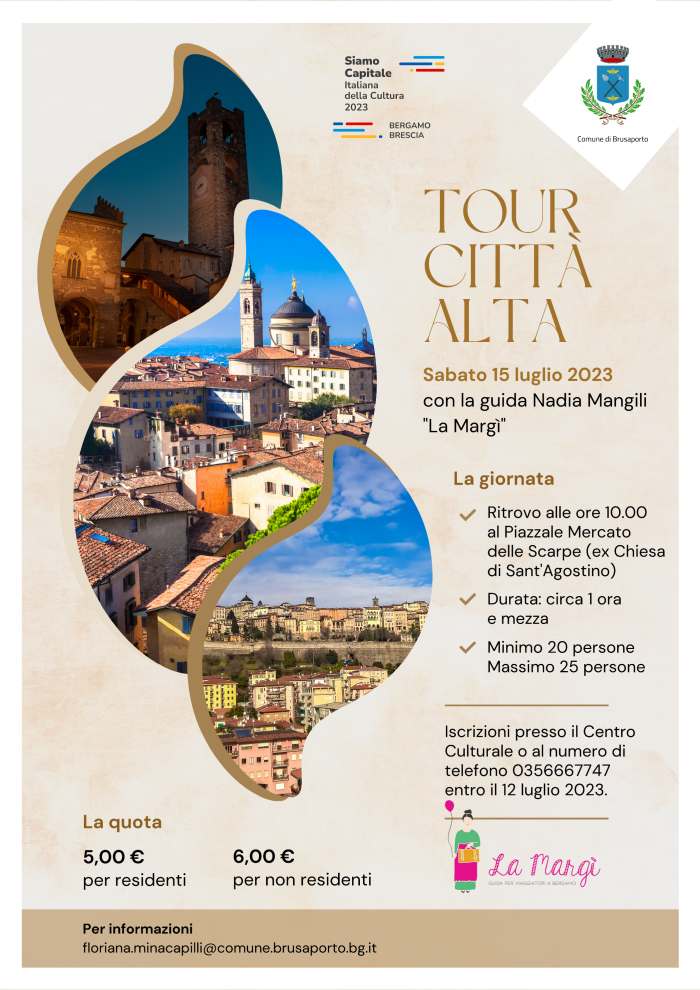 In occasione di Bergamo Brescia Capitale della Cultura 2023, il Comune di Brusaporto organizza un tour alla scoperta di Città Alta. Scopri tutti i dettagli nella locandina.