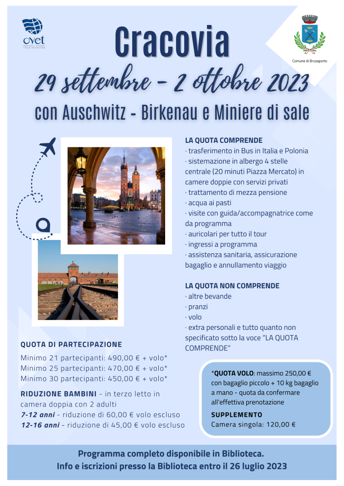 Il Comune di Brusaporto organizza un viaggio di 4 giorni a Cracovia.