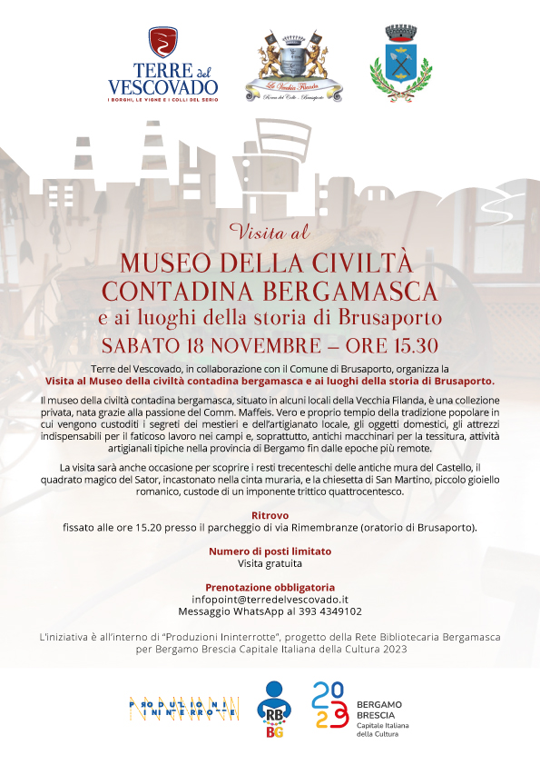 Terre del Vescovado, in collaborazione con il Comune di Brusaporto, organizza la visita al museo della civiltà contadina bergamasca e ai luoghi della storia di Brusaporto. Appuntamento per sabato 18 novembre 2023 alle ore 15:30 presso La Vecchia Filanda.